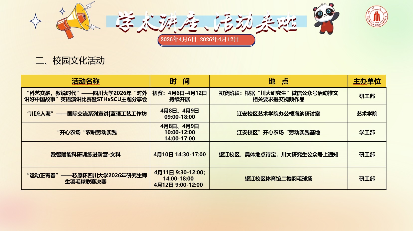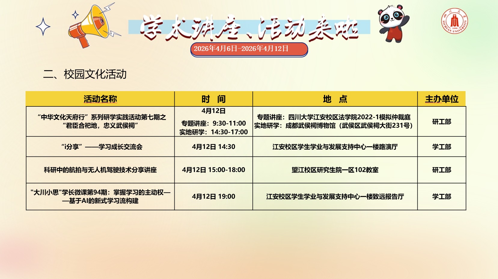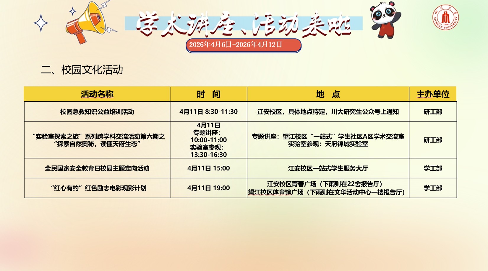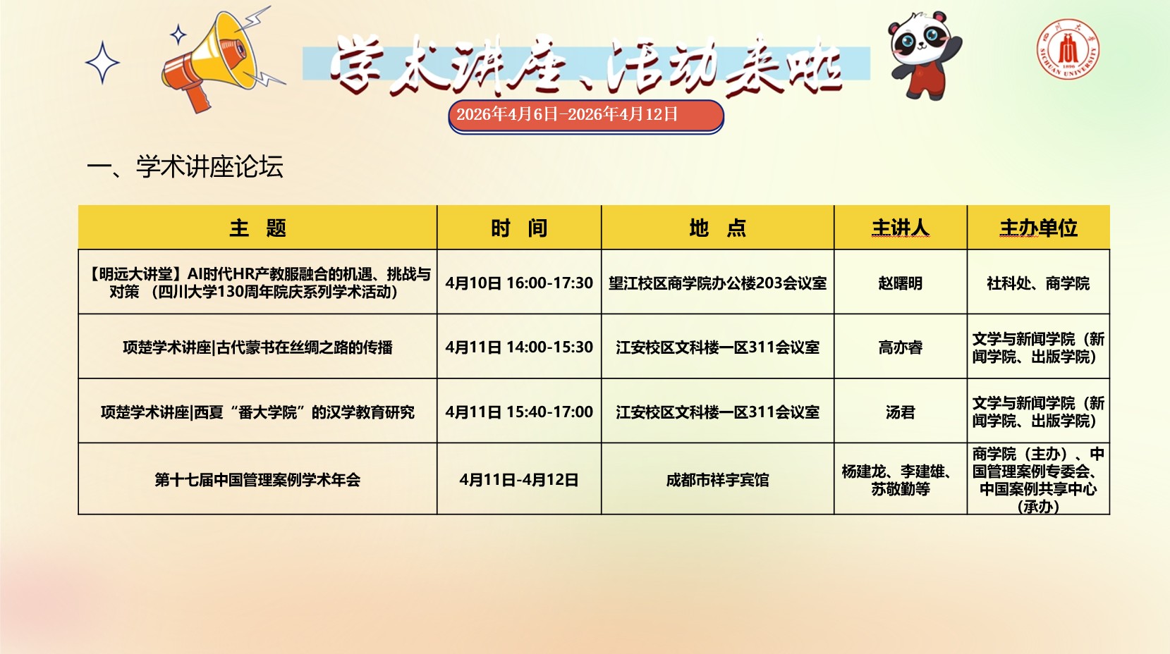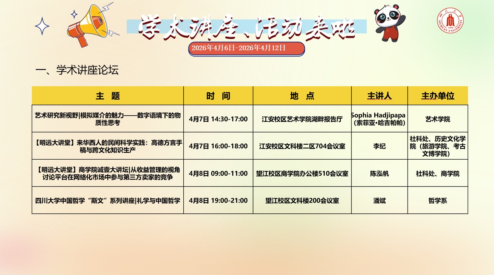学术讲座与校园文化活动预告(2026年4月6日-2026年4月12日