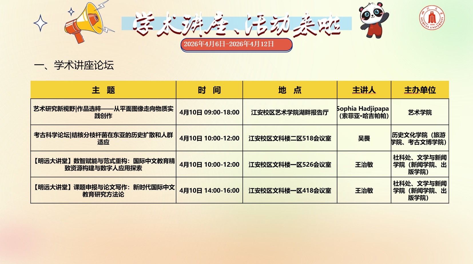 学术讲座与校园文化活动预告(2026年4月6日-2026年4月12日