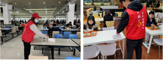 志愿者统一身着志愿者服在江安西园二餐厅、江安(东园)三食堂和望江活动中心食堂就餐区摆放文明就餐的桌牌。同学们陆续进入食堂就餐后,志愿者向有需求的同学发放纸巾并礼貌劝导做好餐后垃圾不留桌、个人餐盘放回收处等文明就餐行为。活动期间,文明就餐桌牌常态化停留在餐桌上,时刻提醒同学们珍惜粮食,餐后带走垃圾,共同营造更加干净整洁的就餐环境。
