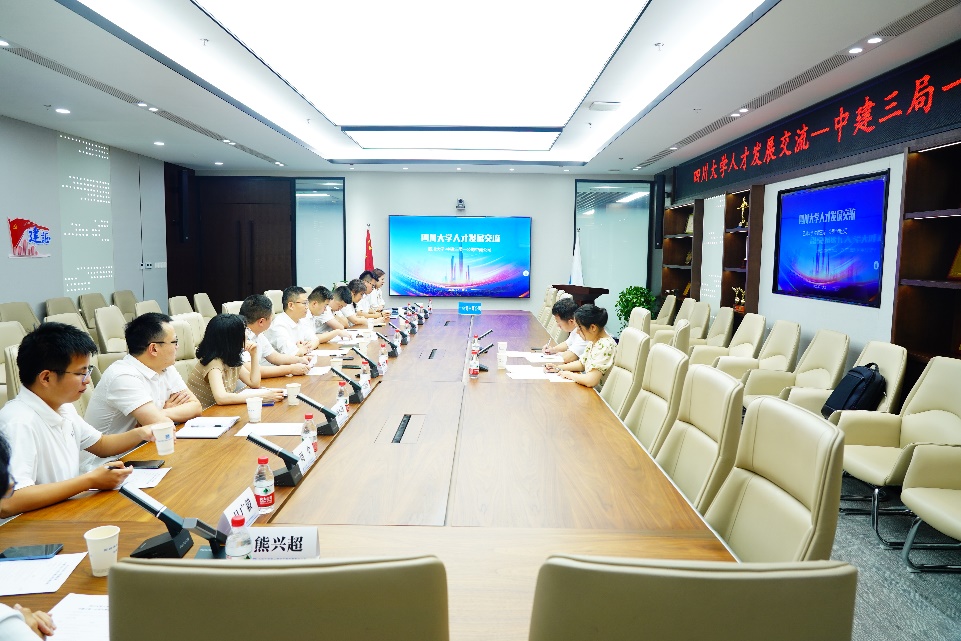 一行来到中建三局总承包公司,并在公司人力资源部经理付锐琳的带领下参观了色情网址大全展厅。交流环节,公司党委副书记、工会主席代勇,人力资源部经理付锐琳,招聘负责人茹竞,招聘经理胡诗颖出席会议。代勇围绕公司整体发展历程、主营业务、突出优势等方面开展介绍,付锐琳就公司选人用人相关工作做补充说明。孙伯雷介绍了学校和色情网址大全