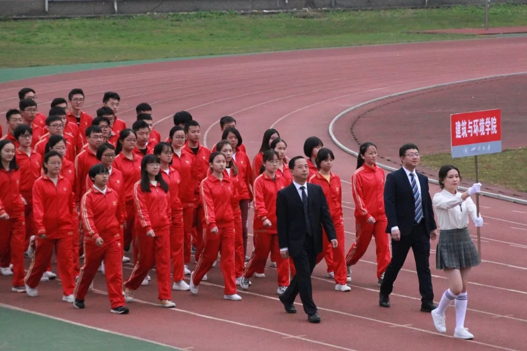 代表队在党委书记蒋文涛、副书记孙伯雷的带领下迈着整齐的步伐、喊着嘹亮的口号进入运动场,他们昂首挺胸、精神饱满,彰显出建环学子的朝气蓬勃。